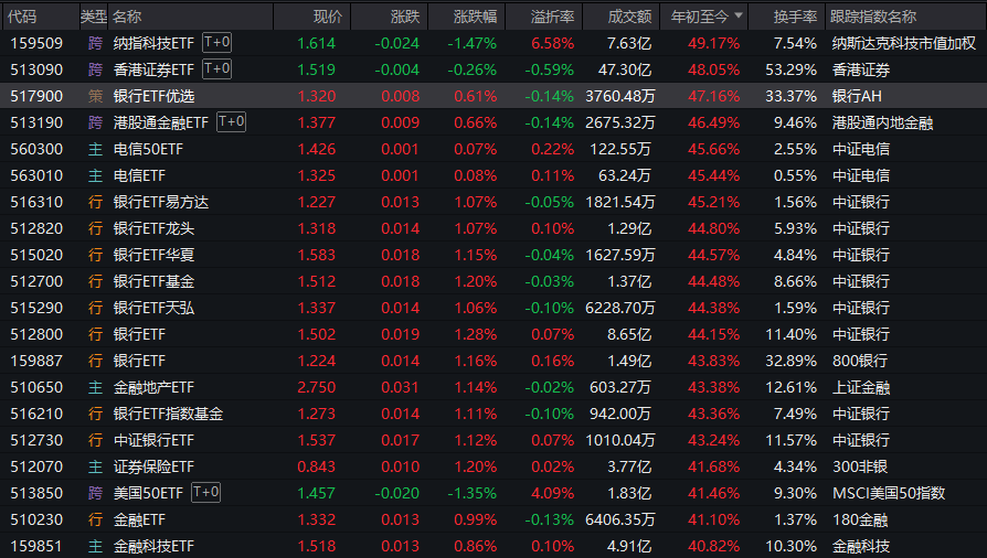 由此,多只银行ETF也稳居年内涨幅榜第一梯队——虽然实际涨幅最大的,目前还有纳指科技ETF、香港证券ETF、电信ETF等少数其他主题产品。