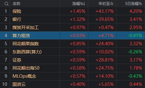 板块方面,保险、银行、煤炭、算力等板块涨幅居前,农业、旅游、海南、铜缆高速连接等板块跌幅居前。