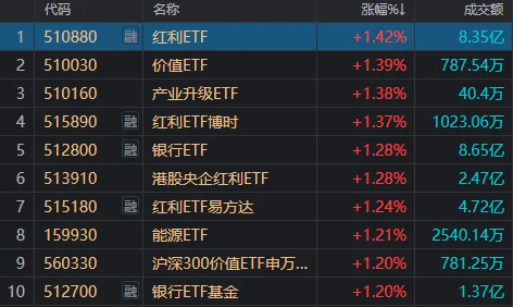 行情提振下,截至收盘,日内涨幅居前的ETF产品,大多带有“银行”“红利”字眼。